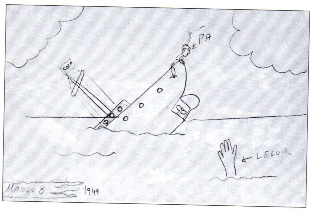 El primer becario que tuvo el Instituto, Alejandro Paladini, recuerda que a menudo antes de irse del laboratorio, Leloir se acercaba a su mesa de trabajo y comentaba los acontecimientos del día, lápiz y papel en mano. A veces garabateaba dibujos que ilustraban los resultados negativos, como el 8 de marzo de 1949, cuando dibujó una jornada sin los resultados esperados. En la ilustración se ve un barco hundiéndose, con la palabra CoCo en el mástil (se refiere al UDPG); mientras Paladini (PA) intenta salvarse, Leloir apenas logra mantener una mano en la superficie. 10